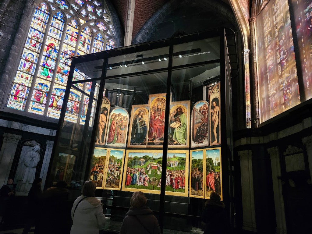 Ghent Tour: The bus ride to Ghent from Brussels is about an hour, arriving within easy walking distance of the Ghent Town Hall. After learning a bit of history and architectural influences, the tour continues past the Bell Tower and St. Bavo’s Cathedral– the latter is home to “The Adoration of the Mystic Lamb” aka The Ghent Altarpiece by Jan Van Eyck (15th c.) It has been masterfully reconstructed after being dismantled and scattered. While the tour does not go in, it is worth using your free time to check it out. The lines can be long and does cost additional money, I recommend you purchase a ticket then go over to Bier Central and enjoy a flight of beer while you wait!